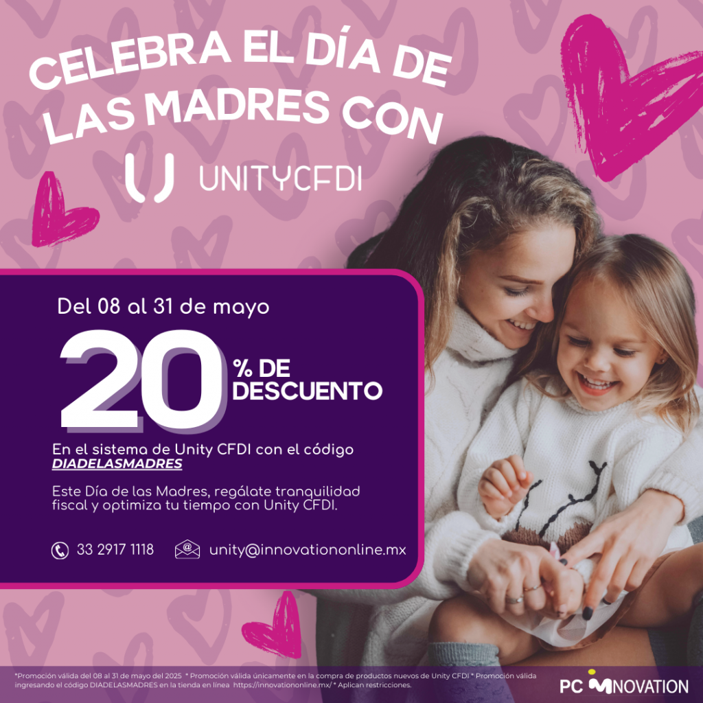 Del 08 al 31 de mayo, aprovecha un 20% de descuento en la compra de licencias nuevas de Unity CFDI con el código DIADELASMADRES . ¡El mejor regalo para tu negocio!