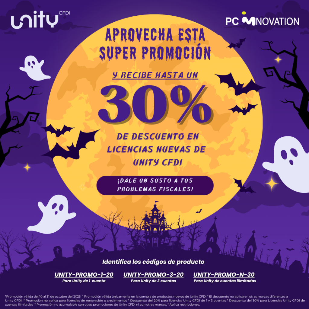 Aprovecha nuestro terrorífico descuento en Unity CFDI y obtén hasta un 30% de descuento en Licencias nuevas, gestiona tus XML del SAT con facilidad. No dejes pasar esta oferta escalofriante. 🕸️🎃